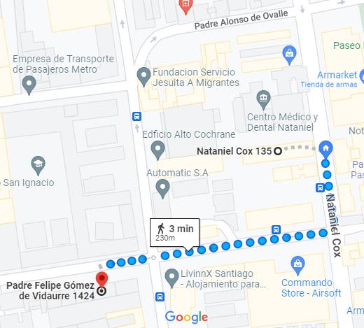 - Con las llaves en tu poder debes caminar hasta la dirección del alojamiento en calle Padre Felipe Gomez de Vidaurre 1424 Santiago Centro, es un edificio azul de 3 piso ubicado entre las calles Lord Cochrane y Corte Suprema.